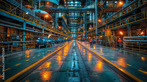 © liubovyashkir, Obraz premium Low angle close up shot of complex pipeline networks of an oil refinery, taken soft morning light