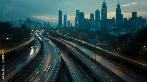 © Generative AI, Obraz premium Low angle curvy flyover highway moving forward road with kuala lumpur cityscape evening scene view : Generative AI