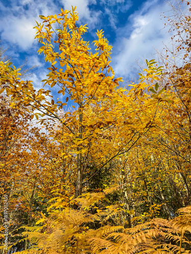 © helivideo, Fototapeta premium LOW ANGLE: Golden chestnut tree and fern leaves glowing under blue autumn sky
