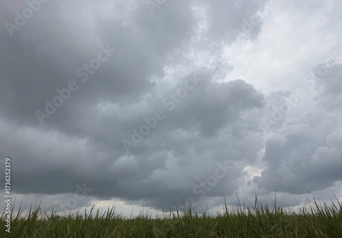 © Romuald, Obraz premium Low angle green grass field with winding narrow footpath leading to distant rolling horizon under ominous dark storm clouds