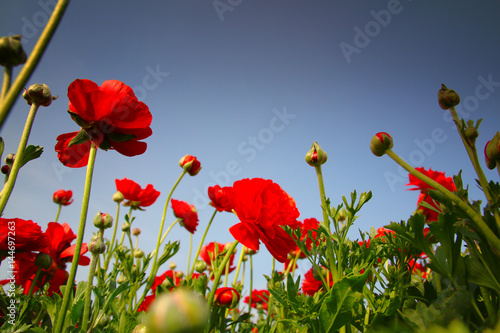 Obraz premium low angle Image of beautiful red spring flowers.