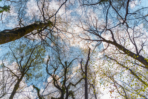 © rfan, Fototapeta premium Low angle photo from a forest under cloudy blue sky