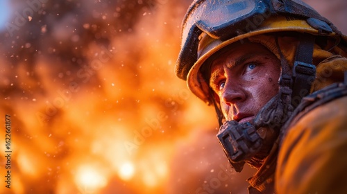 © Aisha, Obraz premium Low angle photo of firefighter, background building engulfed in blurred flames