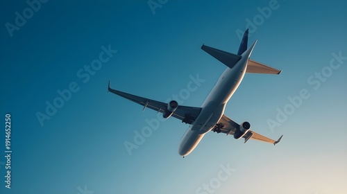 © Dsr, Fototapeta premium Low Angle Rear View of Commercial Passenger Airplane Flying Overhead with Clean Sky Copy Space