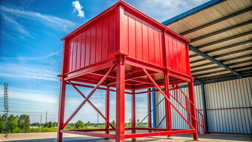 © anu, Obraz premium Low angle red metal stand for water tank with shallow depth of field in daylight