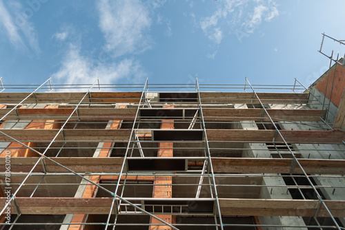 Fototapeta premium Low angle scaffolding grid on unfinished concrete building with orange brick...