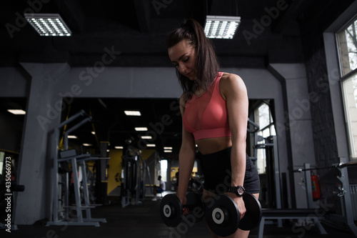 Fototapeta premium Low angle shot of a focused female athlete lifting dumbbells at gym, copy space