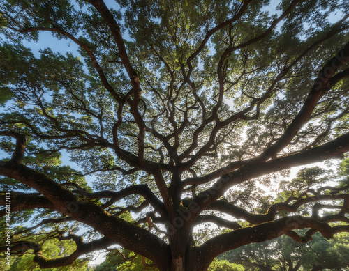 © Moonveil Studio, Fototapeta premium Low-angle shot of a large tree with sprawling branches and green leaves against a blue sky with sunlight filtering through.
