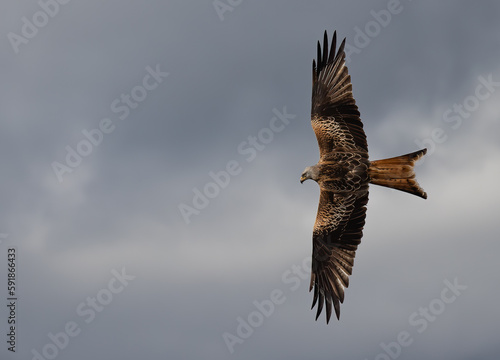 © Kev Kindred/Wirestock Creators, Fototapeta premium Low-angle shot of a Red Kite bird flying with wide-opened wings in a cloudy sky