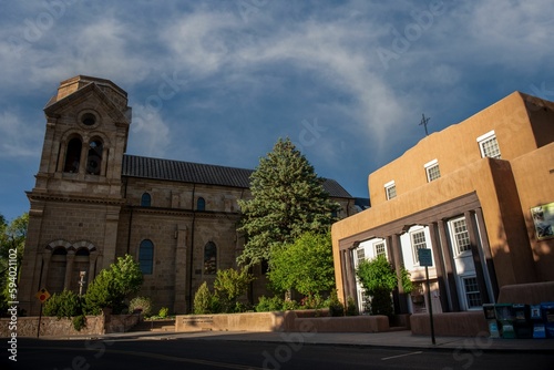 © Panas/Wirestock Creators, Fototapeta premium Low angle shot of Santa Fe plaza and a church against a blue sky in New Mexico