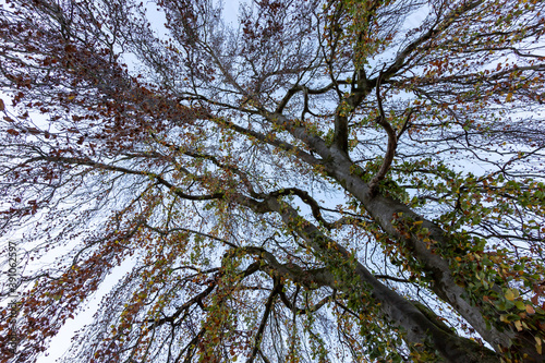 © Stockhausen, Fototapeta premium low angle view into treetops with blue sky in the background