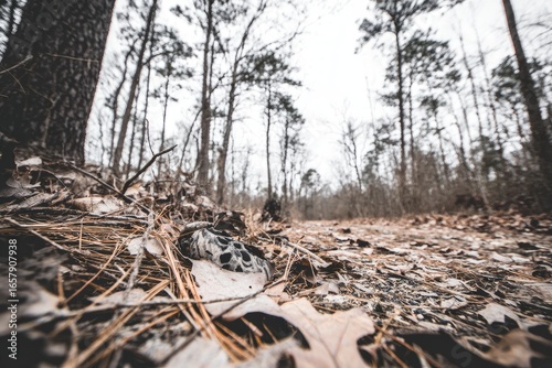 Obraz premium Low-angle view of a forest trail, covered in fallen leaves and pine needles,...