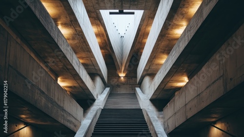 Fototapeta premium Low-angle view of a modern concrete staircase ascending towards a light...
