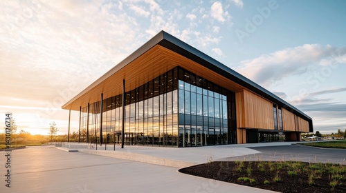 © Elena, Obraz premium Low-angle view of a sleek, glass-facade office building with sharp lines against a serene sky, providing ample copy space