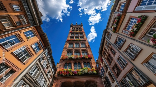 © Alfath, Fototapeta premium Low angle view of a tall building with flowers.