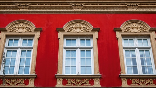 © The 2R Artificiality, Fototapeta premium Low-angle view of a vibrant red structure featuring elaborate beige window frames and decorative accents, showcasing urban elegance