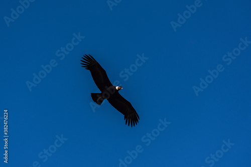 Fototapeta premium Low angle view of andean condor (vultur gryphus) flying against blue sky