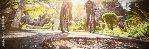 Fototapeta premium Low angle view of biker couple cycling on countryside road