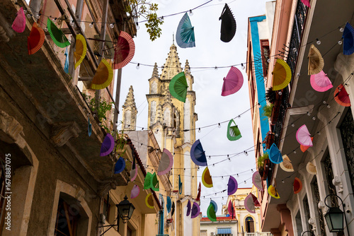 © Anne Richard, Naklejka premium Low angle view of cute garland of fans and lights in a historical city center street, Havana, Cuba