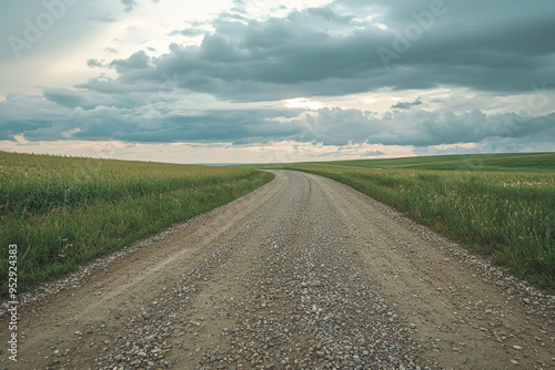 © Hunman, Fototapeta premium Low angle view of gravel road through countryside meadows, captured under a cloudy sky at spring evening.