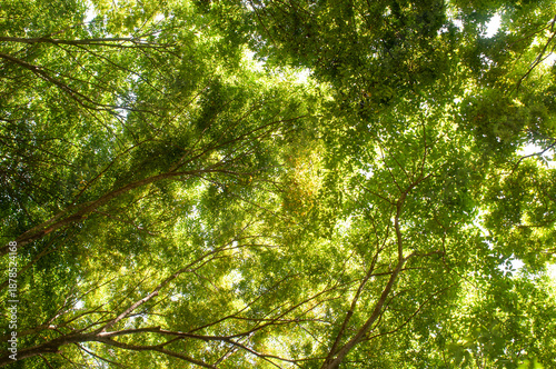 Obraz premium Low angle view of lush green tree canopy with sunlight filtering through leaves in summer