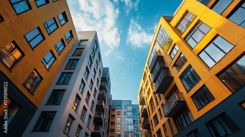 © Jaaabz, Fototapeta premium Low-angle view of modern apartment buildings, sunlit, vibrant yellow and gray facades, balconies, and windows against a bright sky