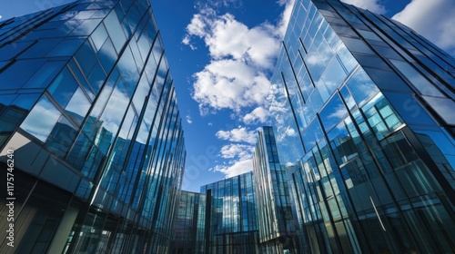 © SlashStd, Fototapeta premium Low-angle view of modern glass skyscrapers against a bright blue sky with fluffy clouds.