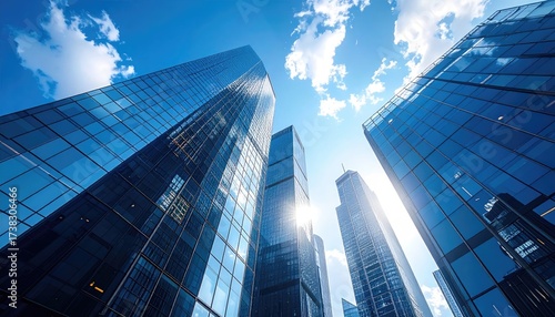 © Berkah6, Naklejka premium Low Angle View of Modern Glass Skyscrapers Against Blue Sky with White Clouds Sunny Day Reflective Surfaces Contemporary Architecture Urban Landscape