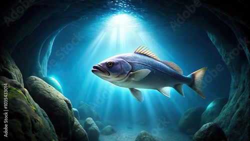 © Hugnaka, Naklejka premium Low angle view of mysterious glowing fish in dark underwater cave abyss