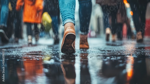Fototapeta premium Low angle view of people walking through a puddle on a rainy day.