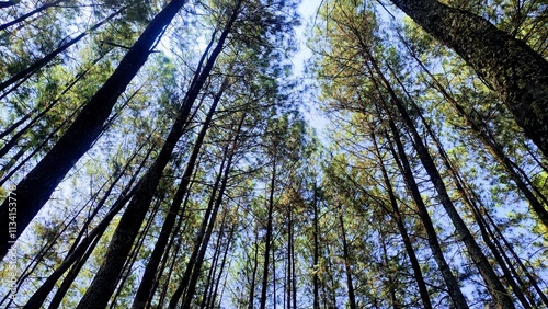 © Gianti, Fototapeta premium Low angle view of pine trees with blue sky background. Empty blank copy text space.