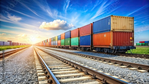 Fototapeta premium Low angle view of railway track with container trains against sky blue...