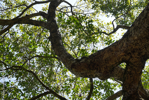 Fototapeta premium Low angle view of Tall tree and green leaves. Tree in the forest.