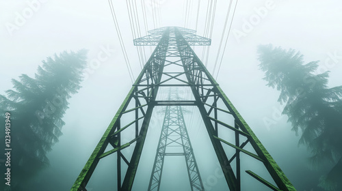 © Panupan, Obraz premium low angle view of towering power pylon surrounded by misty trees creates mysterious atmosphere. structure stands tall amidst fog, emphasizing its height and industrial design