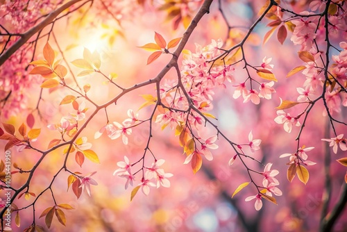 © Hugnaka, Obraz premium Low angle view of tree branches with pink leaves in soft sunlight, perfect for wallpaper or background