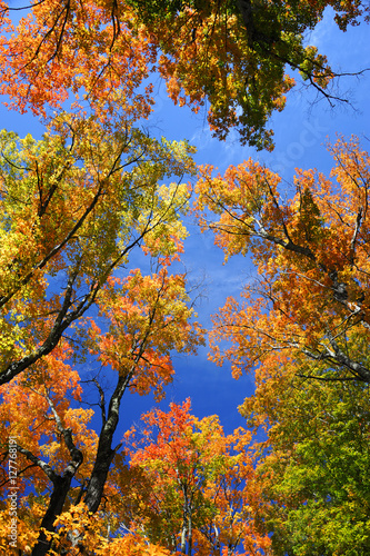 © nd700, Naklejka premium low angle view on colorful autumn trees and sky