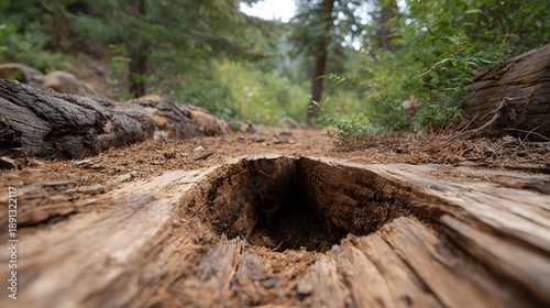 Obraz premium Low angle view reveals a decaying hollowed out fallen log on a forest path inviting explo n