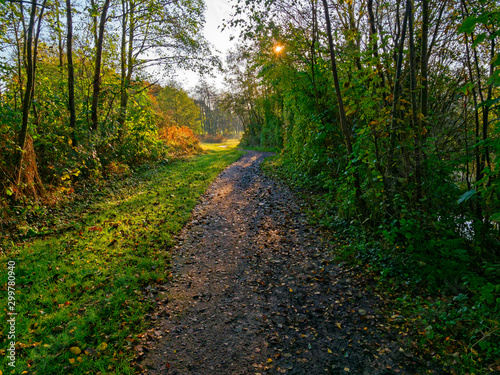Fototapeta premium Low autumn sunlight shines between tall trees and across a narrow winding...