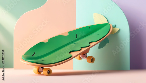 Fototapeta premium Low-carbon 3D concept. Skateboard designed as a leaf against pastel-colored backdrop.