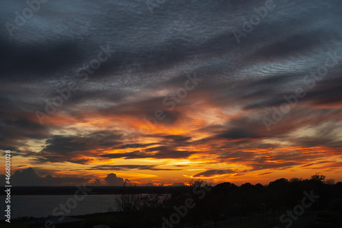 Fototapeta premium Low clouds forming a dramatic, fiery sky at sunset over water.