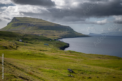 Obraz premium Low clouds hang over the remote Scandinavian island of Nolsoy in the Faroe...
