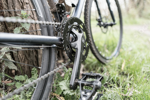 Fototapeta premium Low down view of a new but dirty cross bicycle showing the front cog and chain system. Seen leaning against a forest tree in rural UK.