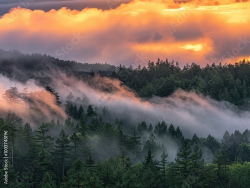 © buraratn, Obraz premium Low Hanging Clouds Over Serene Forest Landscape