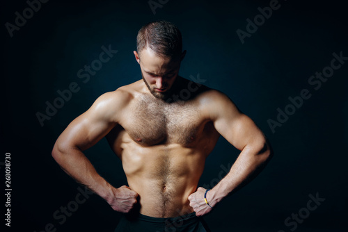 Fototapeta premium Low key portrait of muscular shirtless man at dark background