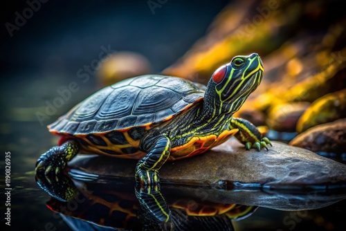 Fototapeta premium Low Light Aquatic Turtle on Stone - Trachemys scripta Night Photography