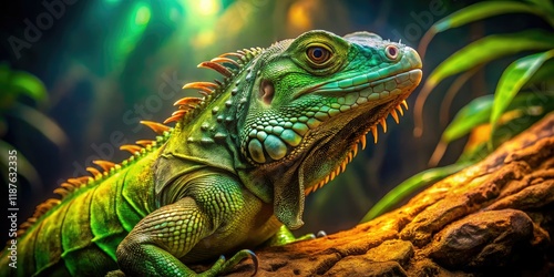© sanom, Fototapeta premium Low Light Iguana Terrarium - AI Photorealistic