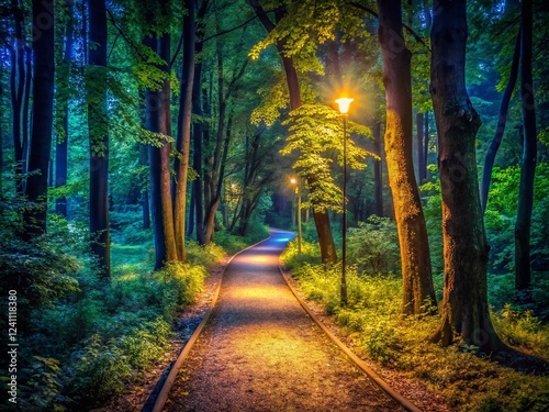 © Arnada, Fototapeta premium Low Light Running Path: Serene Nighttime Jog Through Trees