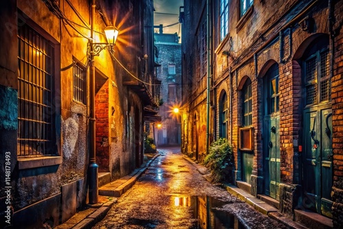 Fototapeta premium Low Light Urban Exploration Photography: Dark Alleyways, Gritty Cityscapes, Night Photography, Street Photography, Urban Decay, Atmospheric Photography, Mysterious Backstreets