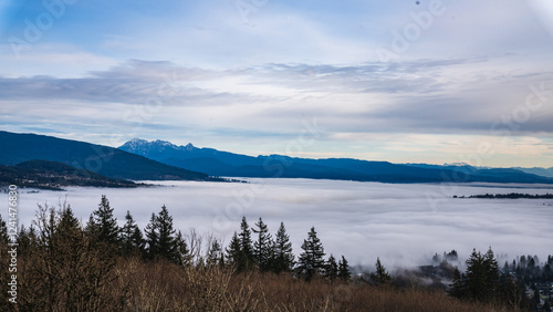 © Andrew, Fototapeta premium Low-lying clouds over Fraser Valley, BC, Canada with alpine mountains in silhouette on horizon.