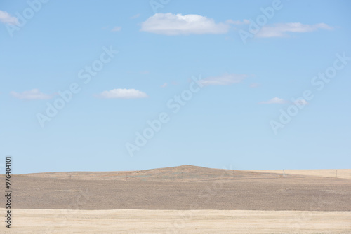 Fototapeta premium Low mountains in the steppe, blue sky and clouds